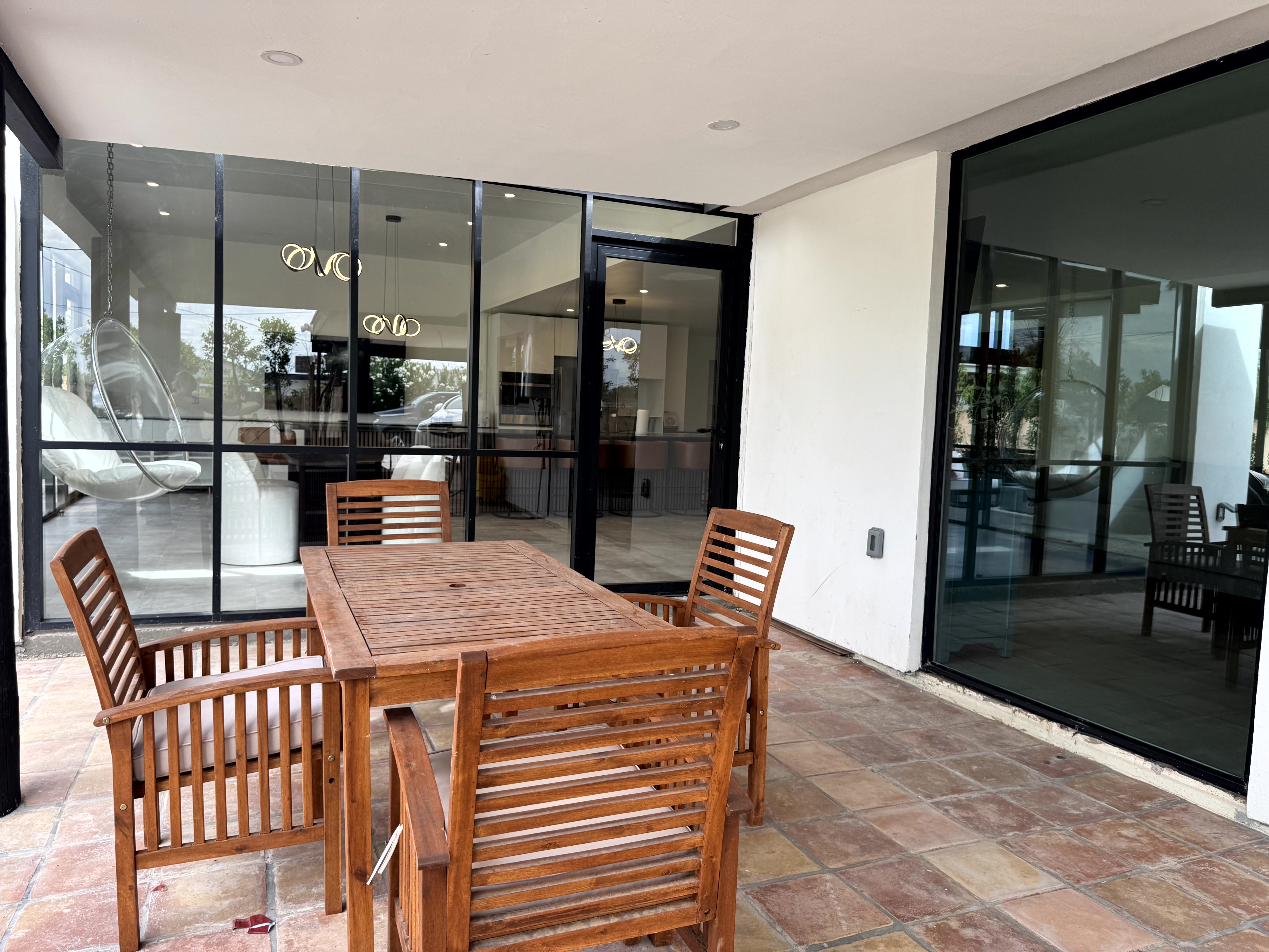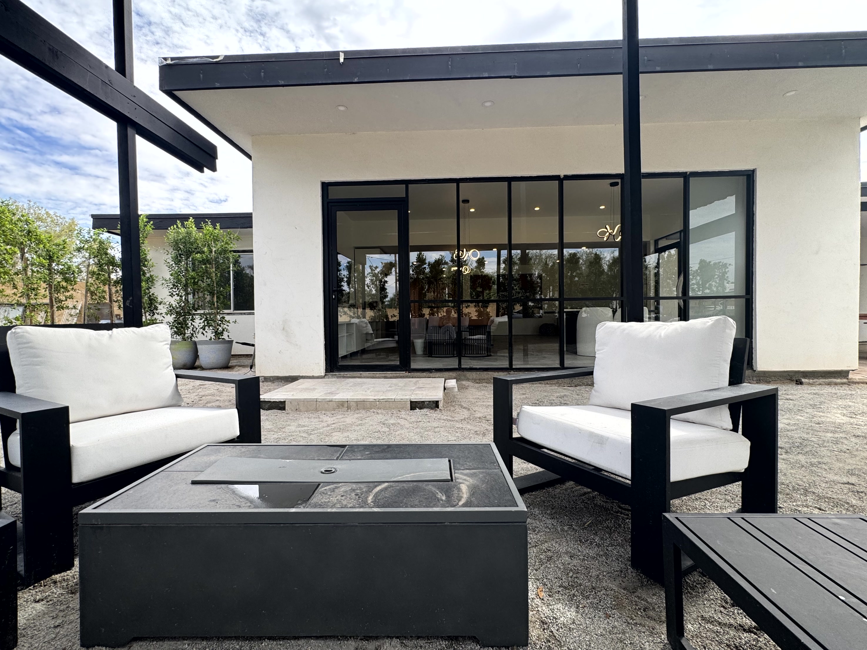 Modern patio furniture, large fire feature, custom large pergola, oversized gold chandelier for perfect outdoor lounging ambiance